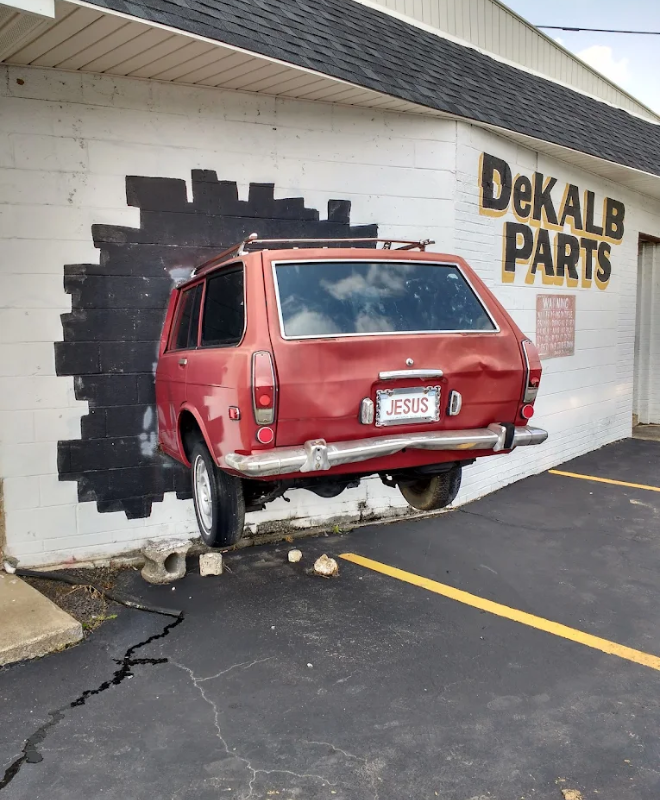 You know you’re in for an interesting drive when you spot the front half of a car sticking straight out of a brick wall with the word “JESUS” boldly displayed above it. No, it’s not the aftermath of a wreck—it’s art… or a message… or maybe both? This unexpected roadside sight sits just off the main road in  Fort Payne at DeKalb Parts Co. and has been confusing and delighting passersby for years.