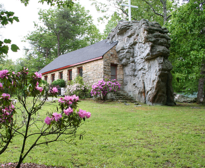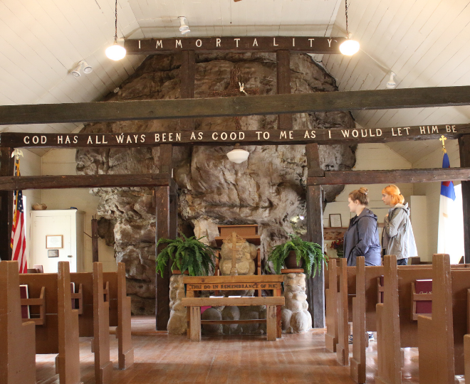 Colonel Howard had always dreamed of recreating a chapel he and Sallie had once visited during a trip to Europe. One of his final accomplishments before his death was making that dream a reality. The result is a charming, one-of-a-kind church that incorporates a massive rock right into its walls. But what really makes the chapel special are the personal touches—above the pulpit, a beam is inscribed with Sallie’s words: “God Has All Ways Been As Good To Me As I Would Let Him Be.”