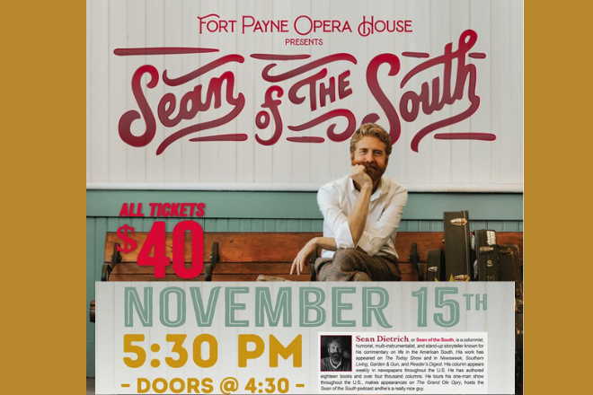 Sean of the South Join us for an evening of music, stories, and laughter as Landmarks of DeKalb County, Inc. is pleased to announce the return of author & humorist Sean Dietrich, better known as Sean of the South, to the historic Fort Payne Opera House. The doors open at 4:30 and the show starts at 5:30. All are welcome to join Sean at a meet and greet after the show where he’ll be hugging necks, signing books and taking photos. As always, you are most welcome to bring your books from home to have them signed. Books and other merch will be available before and after the show. All tickets are $40.
