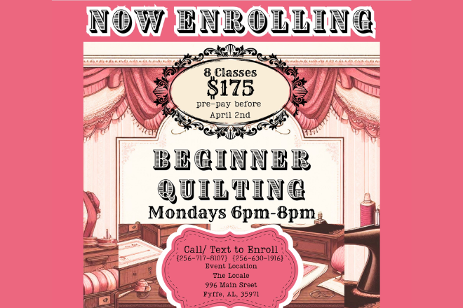 Beginner Quilting Class Learn all the basics to quilting and make a quilt of your own!! Beginners quilting class will be at The Locale in Fyffe. Will meet on Mondays starting April 14th from 6 pm to 8 pm. $200 for an 8 week class.