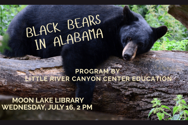 Black Bears in Alabama Get the latest updates on the local bears at this informative session by the Canyon Center educators. Our annual bear talks are among the most popular library programs. This one is open to all ages. Please note: additional parking is available at Moon Lake Campus where visitors can park and then enter through the library’s side door. You can also park on the grass beside the library in a designated area that has been reinforced with a plastic grid.