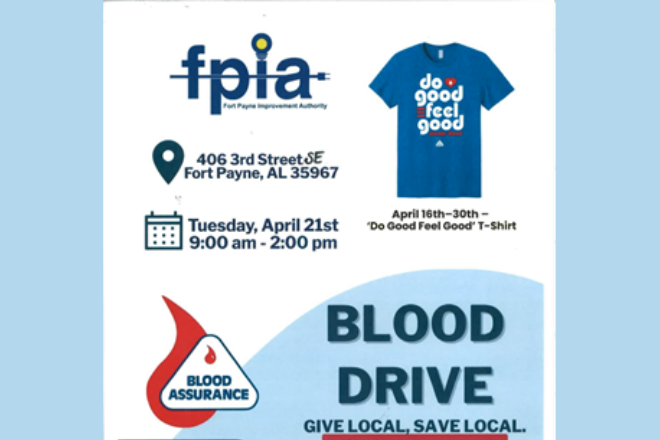 Blood Drive at FPIA Blood Drive: FPIA & Blood Assurance Our friends at the Fort Payne Improvement Authority are hosting a blood drive with Blood Assurance. Mark your calendar, start working on your hydration now, and help save a life! Give Local, Save Local