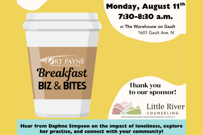 Breakfast Biz & Bites: Little River Counseling Come hear from Daphne Simpson with Little River Counseling as she shares insights from her practice, highlights how loneliness often plays a role in mental wellness. You’ll also have the chance to tour her office, conveniently located just off the Warehouse on Gault ( 1601 Gault Ave. N, Fort Payne AL 35967), and stay to make meaningful connections with others in your community!