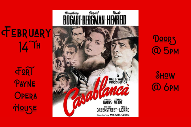 “Casablanca” The Fort Payne Opera House will be hosing movie night on Valentine’s Day with the classic “Casablanca” “Casablanca” is a 1942 American romantic drama film directed by Michael Curtiz and starring Humphrey Bogart, Ingrid Bergman, and Paul Henreid. Filmed and set during World War II. Doors open at 5pm and Movie starts at 6pm. No Admission fees but there will be concessions available for purchase.