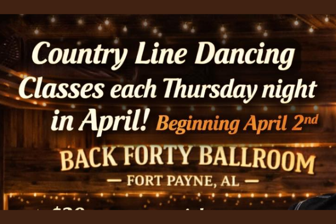 Country Line Dancing: Back Forty Ballroom Pull on your boots and hit the dance floor! Back Forty Ballroom is hosting Country Line Dancing, and everyone is invited to join the fun. Whether you’re a seasoned dancer or trying it out for the first time, it’s a great way to move, laugh, and enjoy a night out with friends. 256-845-3380