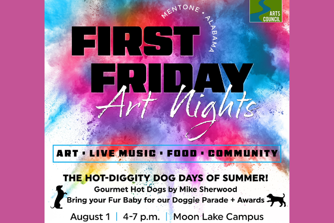First Friday Art Nights Hot-Diggity-Dog Days of Summer! Join us for First Friday on August at Moon Lake Campus for a tail-waggin’ good time! Local artists & makers including: Eclectart Studios • The Vintage Sunflower • Blooming Potentials Pamela Atkins • Irene Millsap • Absolutely Creations Enjoy live music by Parker Thomas. Gourmet Hot Dogs by Mike Sherwood – come hungry! Hot Diggity Dog Parade & Contest – with prizes for: Biggest • Smallest • Cutest • Ugliest • Most Vocal • Best Trick Best Costume • Dog-Owner Look-Alike • Best Dressed • Schmooziest! Bring your pup, your people, and your appetite for art and fun!