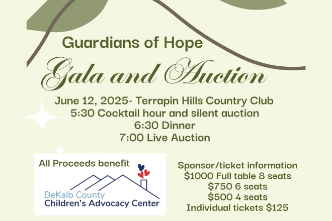 Guardians of Hope Gala and Auction Come join Guardian of Hope for a special night! There will be a cocktail hour, silent auction, dinner and live auction. Terrapin Hills Country Club. All proceeds go to DeKalb Co CAC. Call Tracy Jones at 256-630-0688 or Neil Colbert at 256-899-3810 for more information.