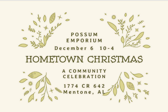 Hometown Christmas at the Possum Emporium We’re spreading holiday cheer at the Possum Emporium and you’re invited to be part of the magic!  Santa arrives at 11 a.m. for photos with the kids, Mentone Springs Youth Choir performs at 2 p.m., S’mores & refreshments served throughout the day, Gift Basket Drawing – don’t forget to enter! There will be crafting tables for kids to get creative and a food drive so bring a donation to support local families in need.