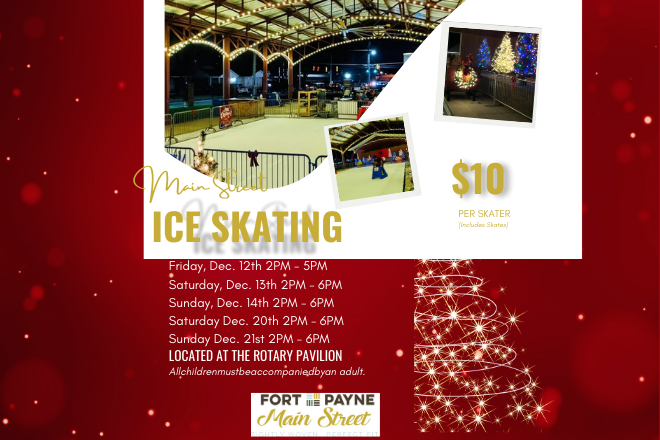 Fort Payne-Main Street is bringing Christmas magic to town with a synthetic ice-skating rink to be located at the Rotary Pavilion at the intersection of Godfrey Ave., and 5th Street next to the Alabama Walking Park. The rink will officially open for business following the annual Fort Payne Christmas Parade on Dec. 8, 7pm to 9 pm. The touch of wintry holiday fun will remain in the air throughout the month of December on various days. Admission is $10.00 (cash) per person for an hour of skating with the skates furnished by Fort Payne-Main Street. Children Must be accompanied by an adult and a signed Accident Wavier and Release of Liability Form will be required..