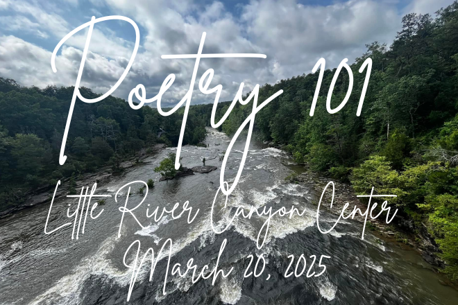 Poetry 101 Get ready for World Poetry Day by joining our Poetry 101 workshop! Discover the joy of poetry in this beginner-friendly workshop and help us fill our “Poet-Tree” display for visitors to enjoy during spring break! Little River Canyon Center. Free and open to everyone! For details, call the Canyon Center at 256-845-3548.