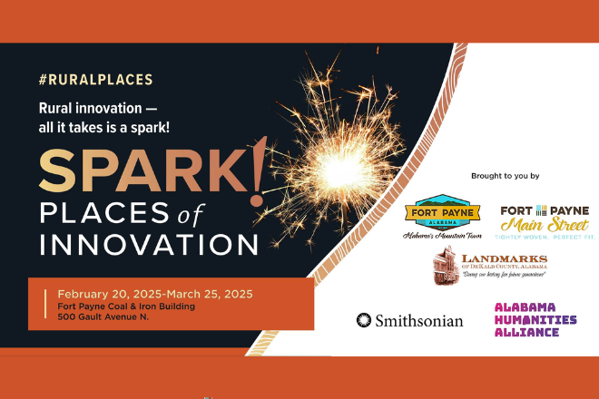 Spark! Places of Innovation A traveling exhibition from the Smithsonian’s Museum on Main Street (MoMS) program, dives into innovation and invention happening in rural America. In small towns across America, people are creating new products, taking risks, meeting challenges together, and seizing upon exciting opportunities that change local life and sometimes reach far beyond. Spark! features stories from over 30 rural communities across the nation that reveal the dynamic relationship between place and creativity. Technical, social, cultural, artistic, or a combination of all of these—every innovation is as unique as each community. Spark! Places of Innovation is part of MoMS, a unique collaboration between the Smithsonian Institution Traveling Exhibition Service, Alabama Humanities Alliance, Landmarks of DeKalb County, City of Fort Payne and Fort Payne Main Street. Explore the ingenuity and tenacity of rural Americans in Spark! Places of Innovation. Catch the Spark! February 20, 2026-March 25, 2026 Fort Payne Coal & Iron Building, 500 Gault Avenue N.