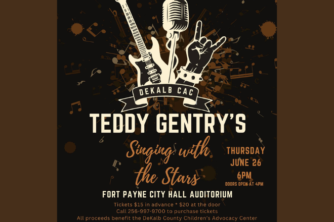 Teddy Gentry’s Singing with the Stars will be held at the Fort Payne City Auditorium. The Proceeds go to the CAC of DeKalb County, Alabama.  Tickets can be purchased at 256-997-9700 or at the door night of event. Doors open at 4 pm and show at 6 pm.