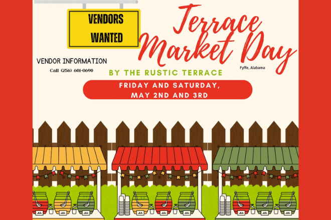 Terrace Market Day Join us for a fun day with vendors and more! Come by for more information at The Rustic Terrace or call 256-601-0690.